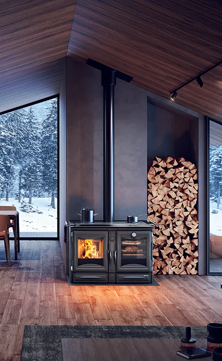 Thanks to the wide 78 l enamelled oven, the large, high-thickness plate, and the 3 cast-iron rings to cook on, Alaska is the ideal tool for your kitchen, so you can rediscover the flavour and tradition of cooking with wood. As well as its other yields, the robust materials and the renewed smoke ventilation system are synonymous with efficiency and excellent performance, fully compliant with restrictive European and international standards. Proof of this commitment to respect the environment, the Alaska model is currently being certified to obtain a 5-star Clean Air classification.