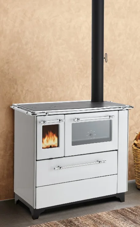 A traditional wood-burning range cooker in enamelled steel with stainless steel trims. As well as cooking, it heats the room by radiation. It is composed of a steel cooktop and a black enamelled oven with a ceramic glass door and a thermometer. A practical deep drawer is located at the bottom of the cooker. It is designed to have a top, rear or side flue outlet.