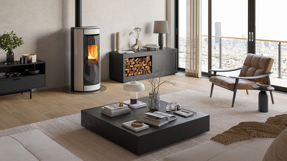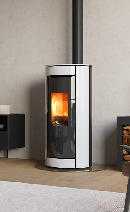 BOTERO T-WIN is the wood-pellet hybrid stove with an exclusive design that embodies all the best of Jolly Mec technology. The pellet combustion takes place through the patented J-EVO 3 burner with load from below, thus ensuring silence and minimizing the cleaning of the brazier. The white ceramic refractory combustion chamber optimises combustion and makes the view of the flame even more pleasant. You can change fuel at any time: the transition from wood to pellets occurs automatically, and it’s possible to use the pellet flame to ignite the wood. The wood combustion is optimized thanks to the use of forced smoke extraction. Botero T-WIN is powered full 24 volts, a technology that guarantees savings in terms of electrical consumption, better combustion control and greater reliability and safety. Botero T-WIN is certified both pellets and wood and works in a hermetic way to avoid taking oxygen from the room and can be ducted.