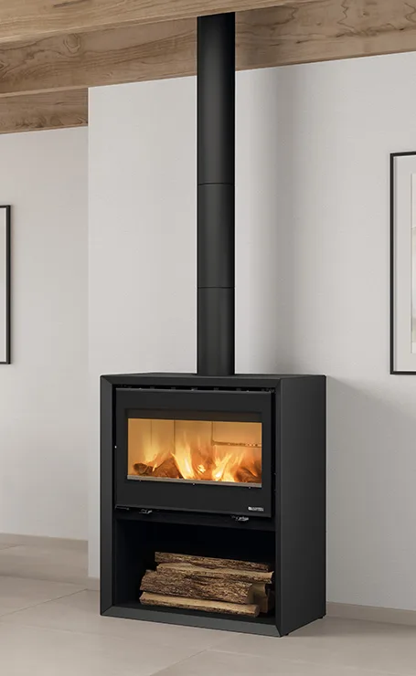 The interior is fully lined with Nordiker refractory, a special material that enhances performance and adds brightness to the firebox, while the grate and fire door are made of cast iron. The exterior features a matte black steel finish and is available in different versions: a vertical and linear design with a lower log holder, or a more distinctive option with an elegant 145 cm horizontal bench, allowing the stove to be positioned according to aesthetic preferences or installation needs.