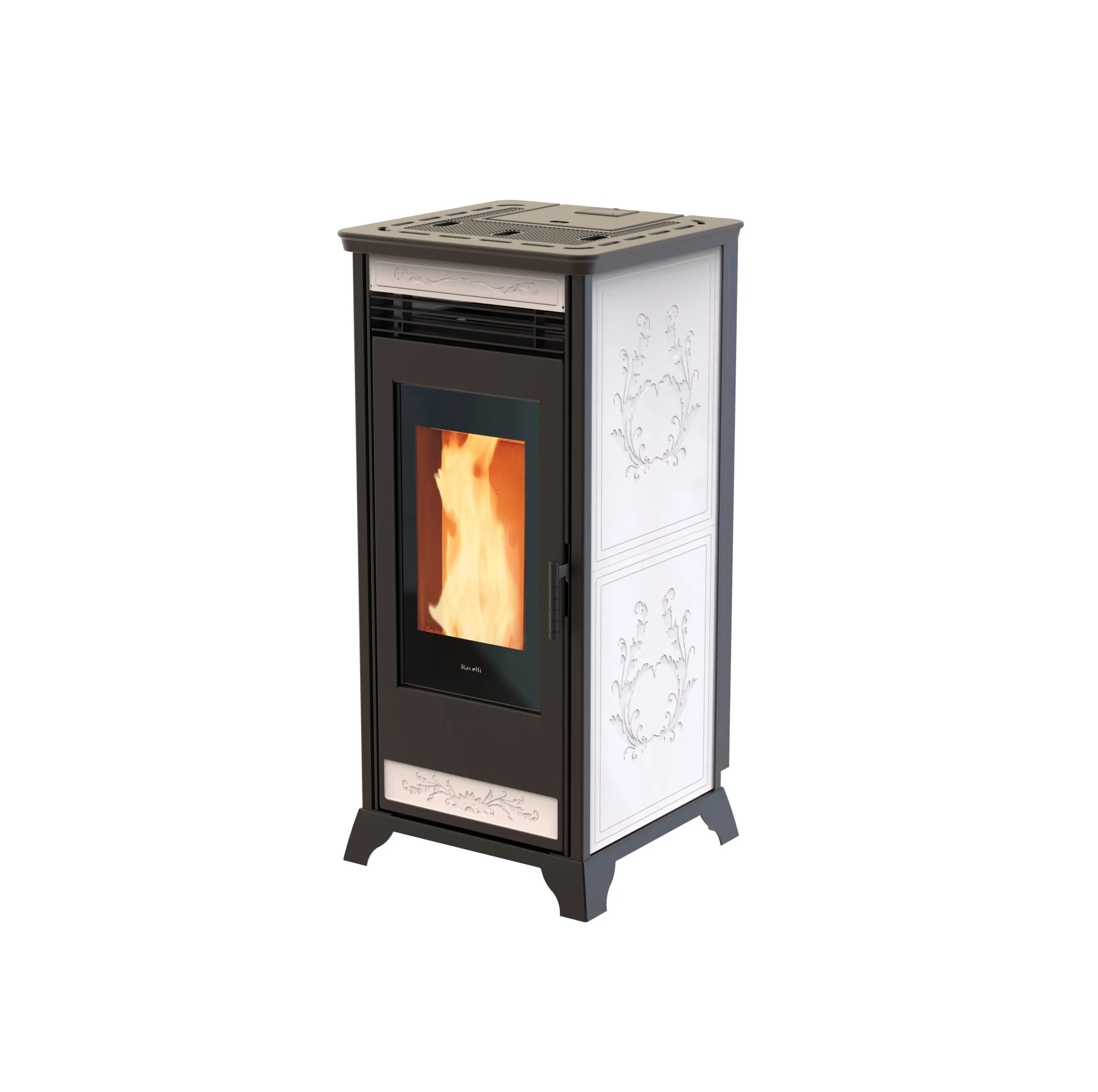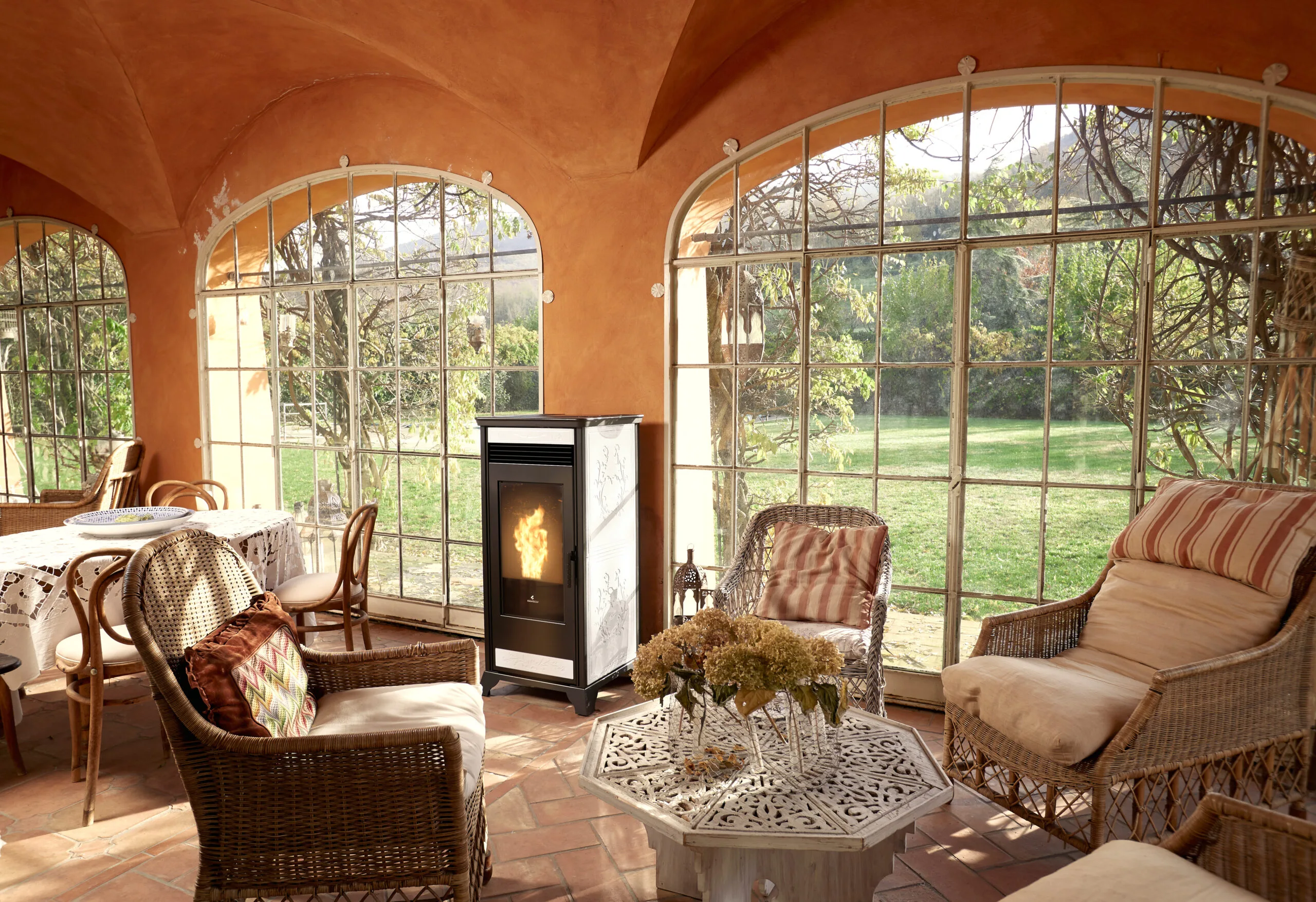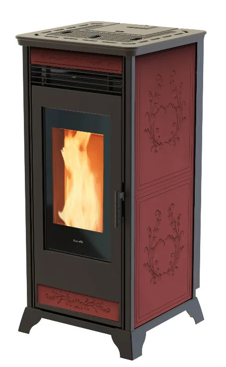 The shape of this elegant ceramic stove is enhanced by its traditional design. Moreover it has a cast-iron top to ensure a perfect distribution of the heat. This model is available in three colours: white, black and Bordeaux.