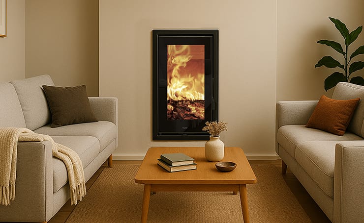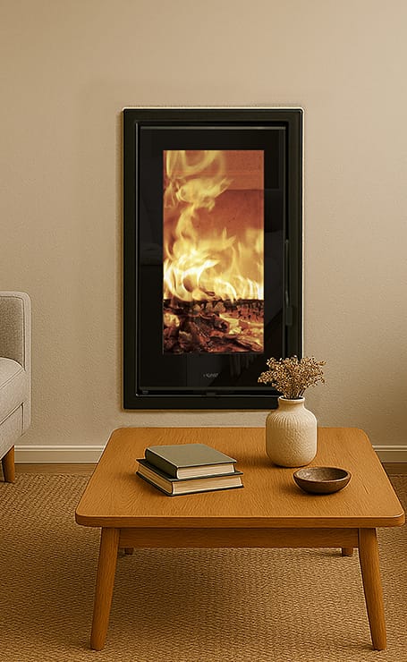 A 5-star wood-burning insert with double combustion and an efficiency of 86%. The structure is made of steel, and the door features elegant silk-screened glass. The firebox is lined with vermiculite. Its design is quite distinctive, thanks to a vertically developed combustion chamber. It is equipped with a clean glass (air-wash) system. It can heat an area of up to 230 m³ and meets EcoDesign 2022 requirements for emissions and efficiency.