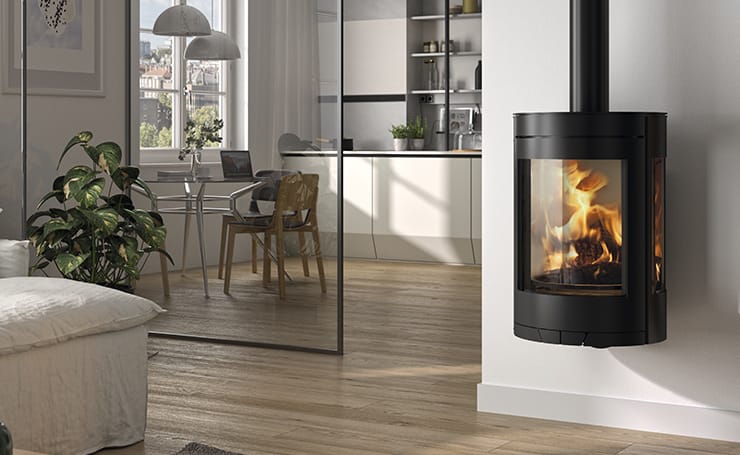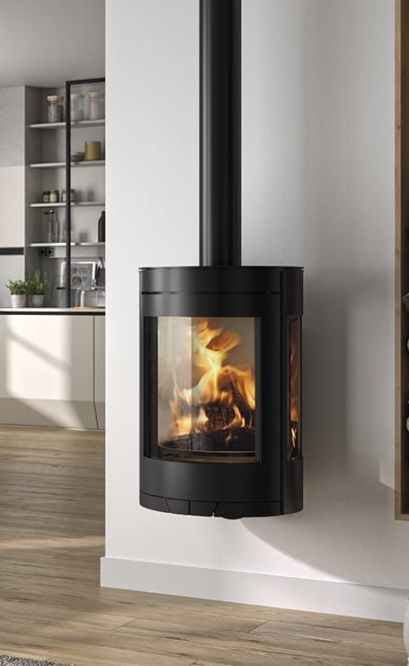 A triple combustion wood stove with an efficiency of 78.5%. The structure is made of steel and the large glasses allow an excellent view of the fire from several sides. The firebox is lined with an elegant white refractory material. It is equipped with the air-wash glass cleaning system. It can reach a heating volume of 240m3. It meets the EcoDesign 2022 requirements with regards to emissions and efficiency.
