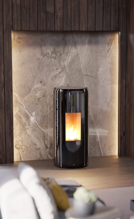 The MATISSE pellet stove is the result of a profound research on the essentiality of shapes, combined with the excellence of 100% Made in Italy craftsmanship. The circle, a primordial and infinite symbol, blends with the vertical line, giving the stove a sense of lightness, originality, and dynamic elegance. Its refined glass cladding is enriched by the tailored texture of two vertical grids running the full height of the stove. A true fusion of timeless elegance and cutting-edge innovation, MATISSE is equipped with VERTICAL AIR® technology, a full 24 Volt system, and the patented J-EVO 3® self-cleaning burner. In SILENT+ mode, it heats naturally without the use of fans, ensuring quiet, even comfort. The full 24-volt power supply guarantees lower energy consumption, more precise combustion control, and enhanced reliability and safety. With the optional battery kit, MATISSE can operate for several days even in the absence of electricity. When combined with the Jolly Mec photovoltaic kit, it reaches maximum autonomy, continuing to run even during power outages.