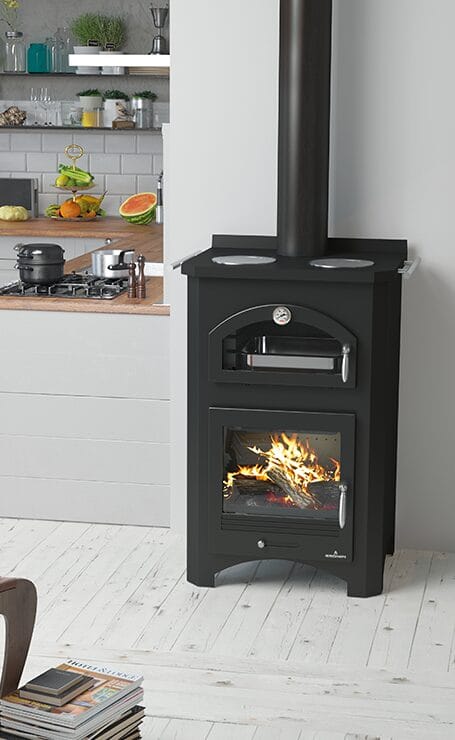 The Monza stove by Bronpi is a wood-burning stove with an oven and cooking zone, with cast iron rings on the top that allow you to cook comfortably on its surface. The oven, with refractory brick, reaches temperatures of up to 500ºC and includes a stainless steel tray, ideal for roasting.