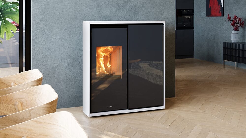 REVERSE S is a combined stove running on wood and pellets, for forced-air and ducted heating. It has two combustion chambers and a single smoke outlet. REVERSE S provides safe savings and heating, as in addition to pellets, it offers wood-fired operation that does not require electricity. The patented SMART AIR system, fitted as standard, allows automatic switching from wood to pellets in complete safety. The outside sliding glass, which can be decorated or plain, completes the scenic effect of the stove allowing you to cover or show the flame at any time.The frame finish is available in soapstone or black or white steel. When functioning in wood mode you can choose to heat by forced air or by radiation. To adapt to different living solutions, the most suitable smoke outlet can be used: rear or top.