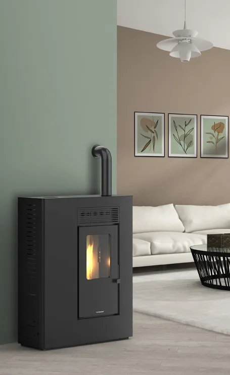 Linear design pellet stove with painted steel cladding. With very small dimensions, especially in depth; a special feature for space-saving situations thanks to the upper smoke outlet. Equipped with blown self-cleaning system that guarantees cleaning and constant combustion efficiency. Quartz igniter for quick ignition. With the hand-held remote control and integrated room sensor, optimum management of room temperature as well as various functions is possible.