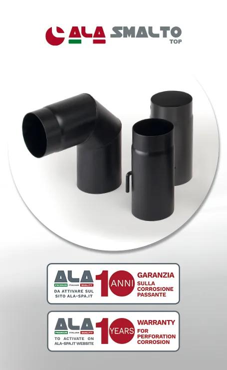 Canali da fumo per stufe a legna, prodotti in acciaio, ad alto spessore, saldati e rivestiti, sia all’interno che all’esterno, con SMALTO PORCELLANATO. L’esclusivo rivestimento in SMALTO PORCELLANATO TERM® permette ad ALA SpA di essere in grado di assicurare, per i canali da fumo ALA SMALTO top, l’inalterabilità del colore, una maggiore resistenza alle condense acide, alle alte temperature, al graffio e alla ruggine. Il particolare rivestimento permette di ottenere uno straordinario effetto opaco che risponde perfettamente alle nuove esigenze estetiche. Disponibile nei colori nero opaco e grigio. Certificati secondo le norme EN 1856-2, EN 1443 con classe di pressione N1, resistenza alla temperatura T600 e classe di resistenza alla corrosione V2. Spessore totale 1,5/1,6 mm.