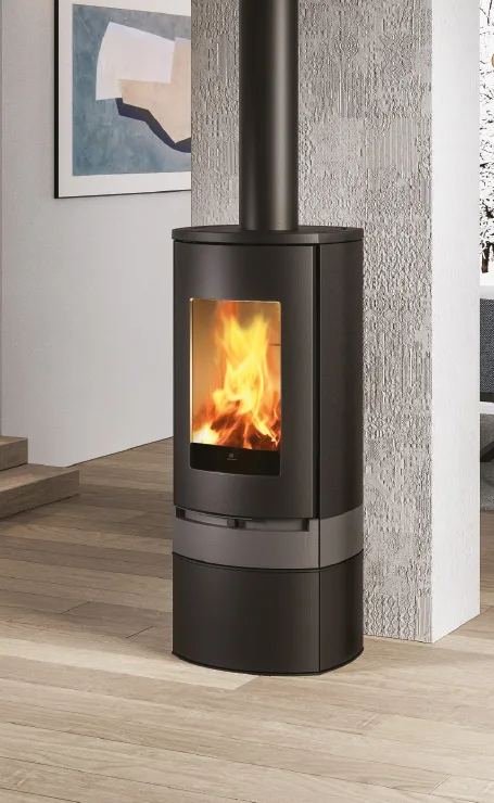 Stufe a legna canalizzabili con ampio vetro che offre una visione della fiamma ampia e profonda. È caratterizzata da un design essenziale, elegante e compatto, dotata di vano porta oggetti con pratica apertura push-pull.