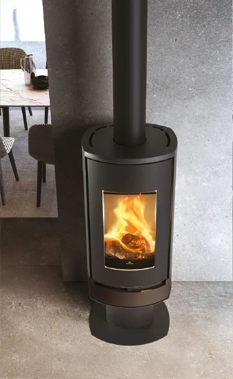 Stufe a legna canalizzabili con ampio vetro che offre una visione della fiamma ampia e profonda. È caratterizzata da un elegante piedistallo che la eleva da terra rendendola una presenza suggestiva e distintiva.