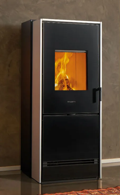 Stufa della collezione Infinity, funzionamento ibrido a pellet e legna. Classe Energetica A+.