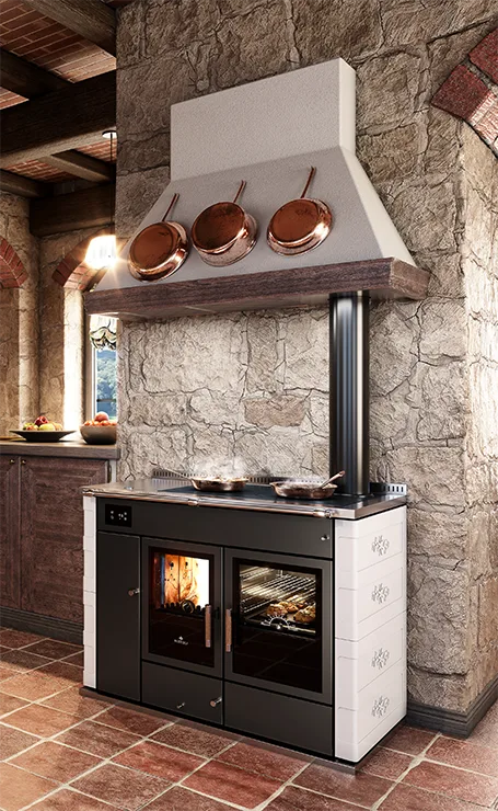 La Serie STP comprende termocucine a legna che per caratteristiche tecniche e funzionali sono al top del mercato: 30,7 KW di potenza, camera di combustione capiente, innata facilità di installazione e di utilizzo. Queste termocucine si distinguono per la possibilità di fornire separatamente sia l’acqua per l’impianto di riscaldamento che per il circuito sanitario. La Serie STP è disponibile in finitura acciaio verniciato, preziosa maiolica lavorata a mano o elegante pietra naturale.