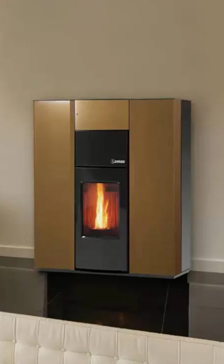 Termostufa innovativa multicombustibile ad alta efficienza con sistema di alimentazione pellet dal basso.